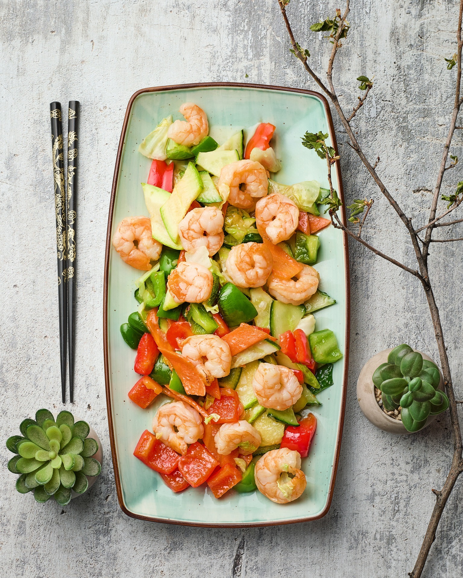 335 Тигровые креветки с черными грибами на доске в сладко-остром соусе